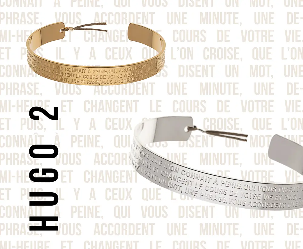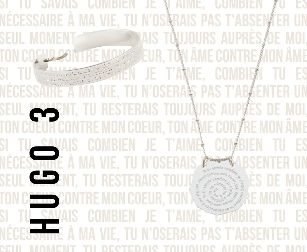 Une phrase, un souvenir, une idée qui résonne… Choisissez le modèle qui vous ressemble et laissez les mots de Hugo devenir votre signature : une collection de bijoux gravés où l’élégance rencontre l’intemporel.